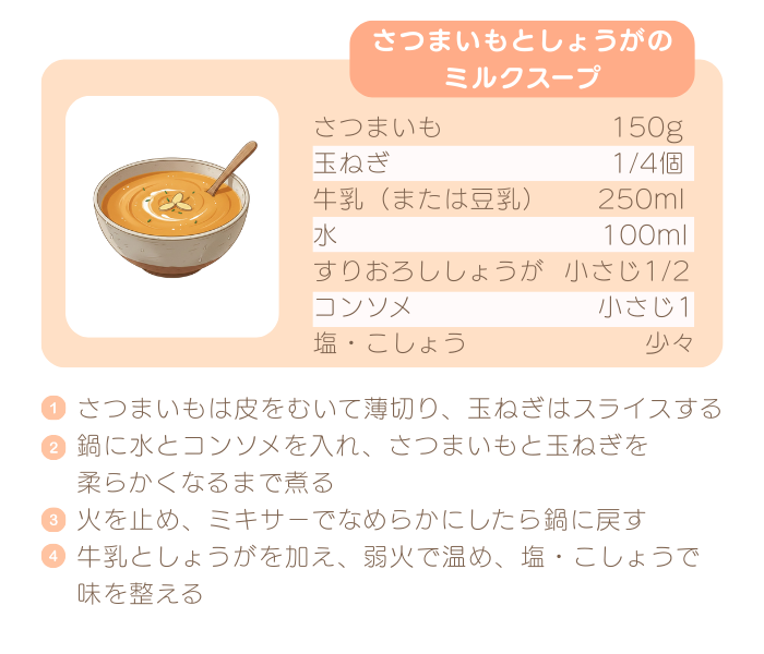 秋の味覚・さつまいもは食物繊維が豊富で、腸内の善玉菌を元気にしてくれます。さらに、体を温めるしょうがを加えることで、冷えやすいお腹をじんわり温め、眠りの準備を整えてくれます。