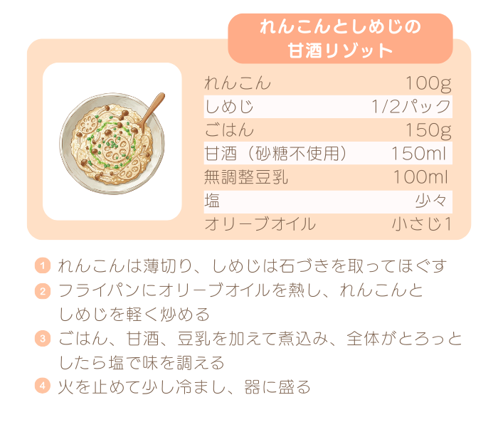 発酵食品である甘酒を使ったリゾットは、腸活にも睡眠にも◎。れんこんとしめじのシャキシャキ感が楽しく、優しい甘みが夜の疲れを癒してくれます。