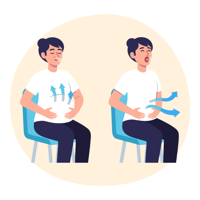 お腹をふくらませるようにゆっくり息を吸い、吐くときはお腹をへこませながら空気を押し出すイメージで行います。
