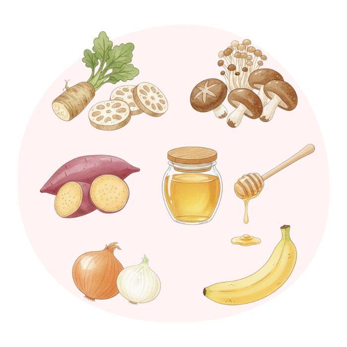 食物繊維はごぼう、れんこん、さつまいも、きのこ類に豊富。秋の味覚を楽しみながら腸を元気にできます。オリゴ糖はバナナや玉ねぎ、はちみつなどに含まれていますよ。