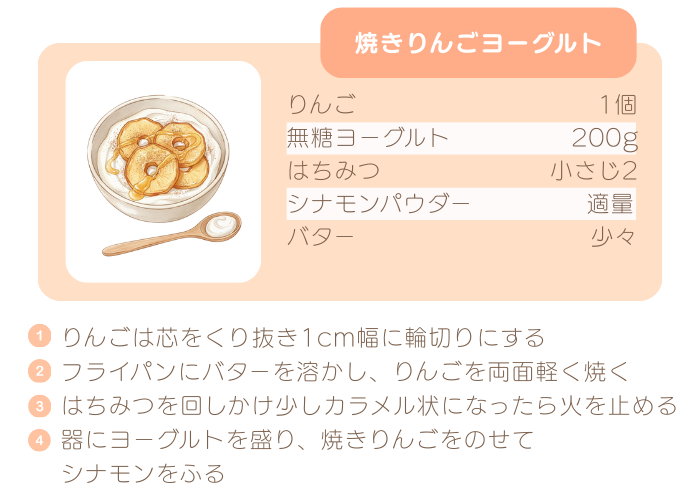 温かいりんごと冷たいヨーグルトのコントラストが楽しく、寝る前の“ごほうびデザート”にもおすすめ。