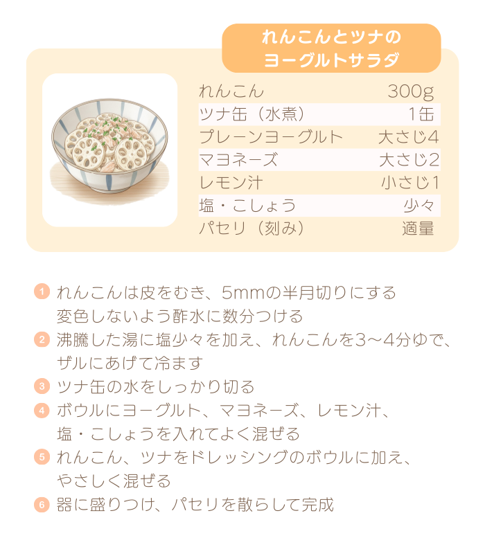レシピ②腸が喜ぶ《発酵×食物繊維!れんこんとツナのヨーグルトサラダ》