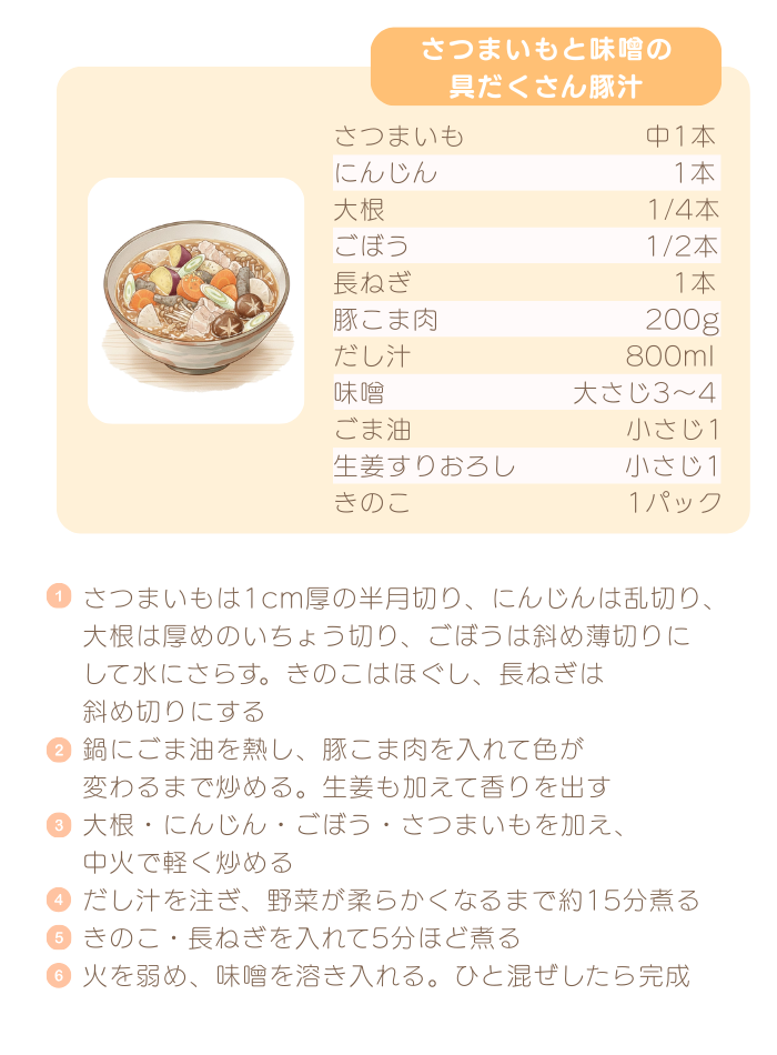レシピ①腸を温める《さつまいもと味噌の具だくさん豚汁》