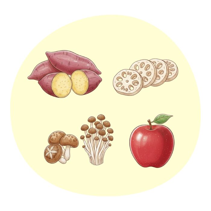 腸内環境を整えるには、善玉菌のエサとなる食物繊維が欠かせません。秋に旬を迎える さつまいも・れんこん・きのこ類・りんご などは、忙しいワーママでも使いやすい食材ばかり。焼くだけ、炒めるだけでも十分美味しく、腸にも優しいメニューになります。