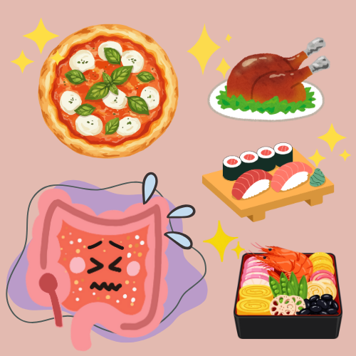 年末年始は炭水化物や脂質が多い食事が続きがちです。さらに生活リズムが乱れ、食べる時間も不規則になりやすく、腸に大きな負担がかかります。