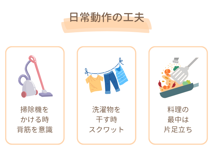 掃除機をかけるときは背筋を意識、洗濯物を干すときに膝を曲げて軽いスクワット、料理中には片足立ちでバランスをとるなど、日常動作をちょっと工夫するだけで立派なトレーニングに。