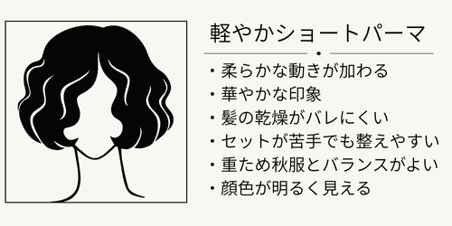 ショートにゆるいパーマをかけると、髪に柔らかな動きが出て、ぐっと華やかさが増します。秋冬は髪の乾燥が気になりがちですが、パーマのカールがあることでパサつきを感じにくく、品よく見えます。
