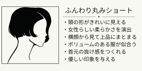 丸みショートは、頭の形がきれいに見えるうえ、女性らしい柔らかさを演出できる万能スタイル。トップに高さを出すことで立体感が生まれ、横顔から見たバランスも上品にまとまります。