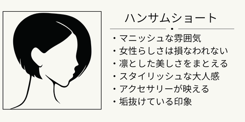 ハンサムショートは、少しマニッシュさを取り入れたシャープなショート。とはいえ、女性らしさを損なわないよう、髪の質感や軽さのバランスを整えることで、凛とした美しさをまとえます。
