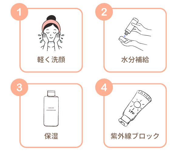 ポイント: 朝はぬるま湯だけで洗う“水洗顔”も◎。肌の常在菌バランスを保ちやすくなります。