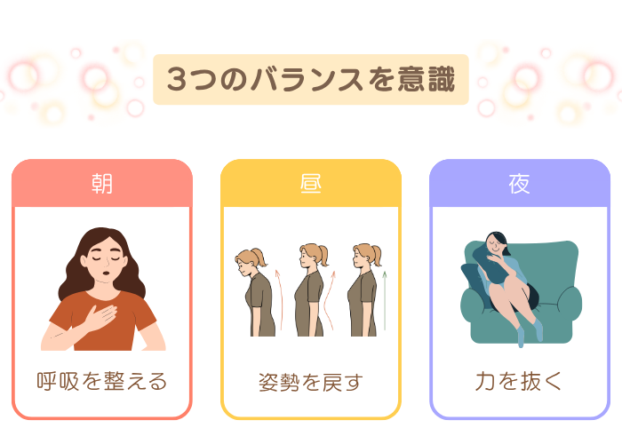 この3つのバランスを意識することで、体と心が1日の中で自然にリズムを取り戻します。