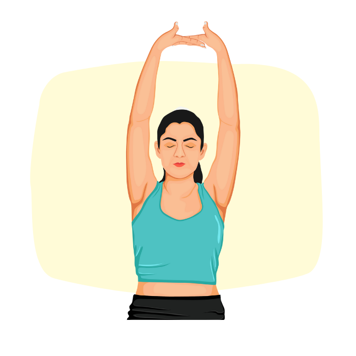 2. 伸びのポーズ — 両手を天井に向かって伸ばし、体側を心地よく引き伸ばす。