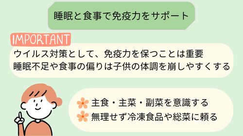 ウイルス対策というと「除菌」や「消毒」に目が行きがちですが、実は免疫力を保つことも非常に重要です。睡眠不足や食事の偏りは、子どもの体調を崩しやすくします。