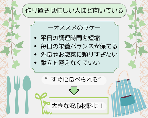 作り置きは「料理上手な人がするもの」と思われがちですが、実は忙しい人ほど向いています。