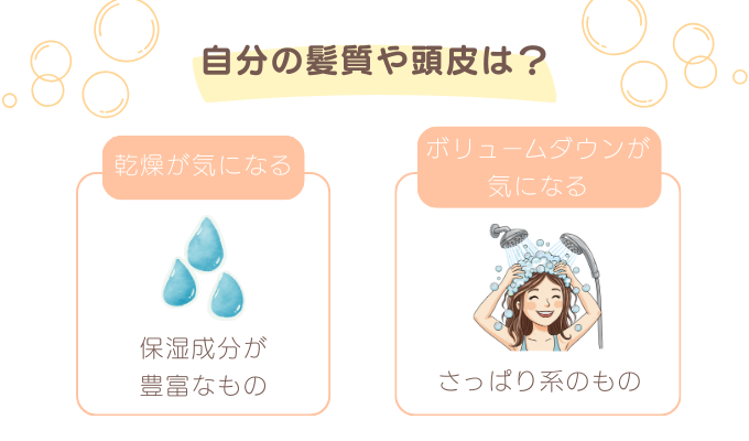 乾燥が気になる方は保湿成分が豊富なもの、ボリュームダウンが気になる方はさっぱり系のものなど、自分の髪質に合わせて選びましょう。商品によって洗い上がりの質感が大きく異なるため、口コミやレビューを参考にするのもおすすめです。
