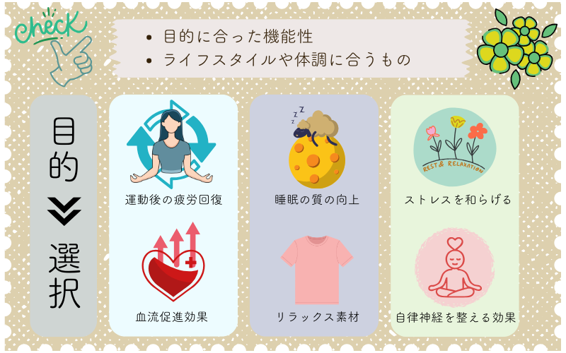 リカバリーウェアを選ぶ際には、疲労回復や睡眠の質向上、自律神経の調整など、それぞれの機能がどのように働くのかを理解することが重要です。