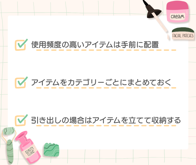 例えば、毎日使う化粧水や乳液は、すぐに手に取れる場所に置くと便利です。