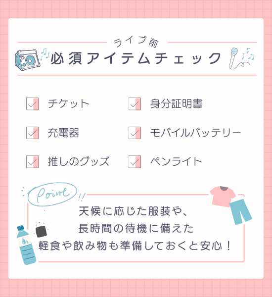 ライブ当日は、心置きなく推しを応援できるよう、しっかりと準備を整えましょう