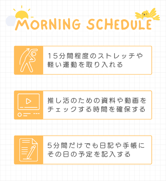 まず、朝の支度時間を少し早めに設定し、その時間を「推し活タイム」として確保しましょう。