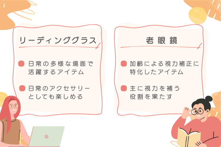 老眼鏡とリーディンググラスの用途には明確な違いがあります。