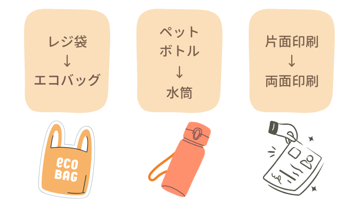 スーパーでのレジ袋はマイバッグを持参する、ペットボトル飲料は水筒やリユースボトルに切り替えるなど、日常の小さな工夫が環境に優しい習慣になります。