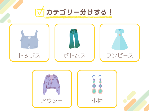 いきなり全体を片付けようとすると、時間も気力も持たないもの。まずは、トップス・ボトムス・ワンピース・アウター・小物といったカテゴリーごとに分けるのがコツです。