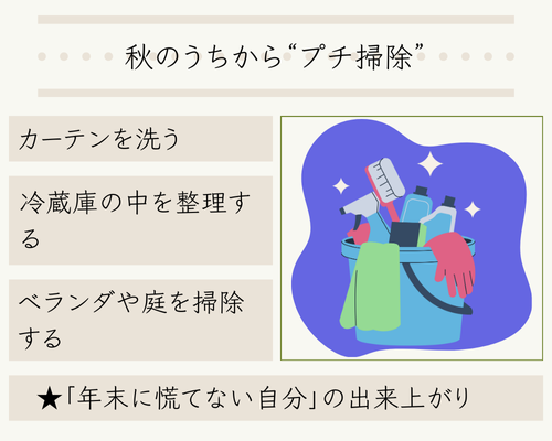 年末の大掃除を一気にやるのは大変。秋のうちから“プチ掃除”を重ねておくのがおすすめです。