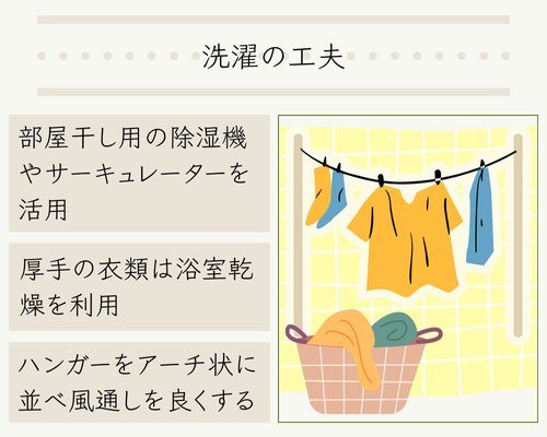 - 部屋干し用の除湿機やサーキュレーターを活用