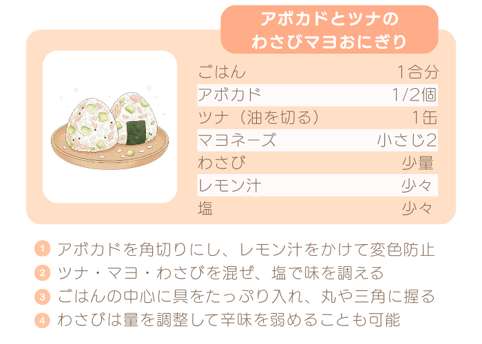 - 美容に◎「アボカドとツナのわさびマヨおにぎり」
