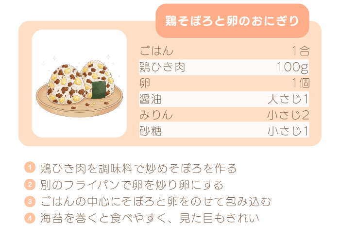 育ち盛りの子どもや、しっかり食べたいときにおすすめなのが鶏そぼろと卵を使ったおにぎり。甘辛い味付けのそぼろと、ふんわり卵の相性は間違いなし。彩りもよく、食卓が華やぎます。