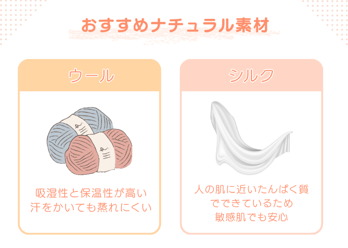 ナチュラル素材の中でも、冷え対策におすすめなのが「ウール」と「シルク」。