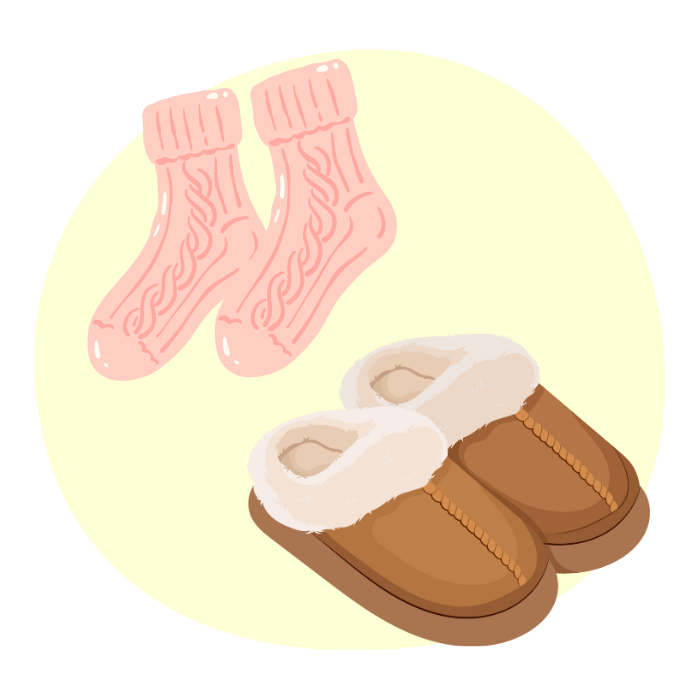 足元の冷えは全身の冷えにつながりやすいため、ルームソックスやボアスリッパをプラスすると温活効果がぐっとアップします。床の冷たさから守りつつ、ふんわりとした履き心地でリラックス感も高まります