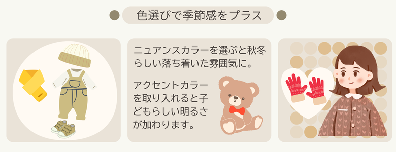 ナチュラル素材の服は、素材そのものの風合いを生かしたやさしい色合いが多いのが魅力。ベージュやアイボリー、カーキなどのニュアンスカラーを選ぶと秋冬らしい落ち着いた雰囲気に。そこに赤やマスタード、チェック柄をアクセントとして取り入れると、子どもらしい明るさが加わります。