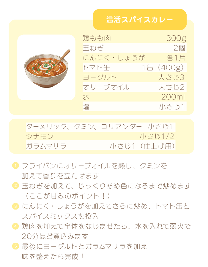 今回は、秋の冷え対策にもおすすめな“温活スパイスカレー”の魅力と、家庭で簡単に作れるレシピをご紹介します。
