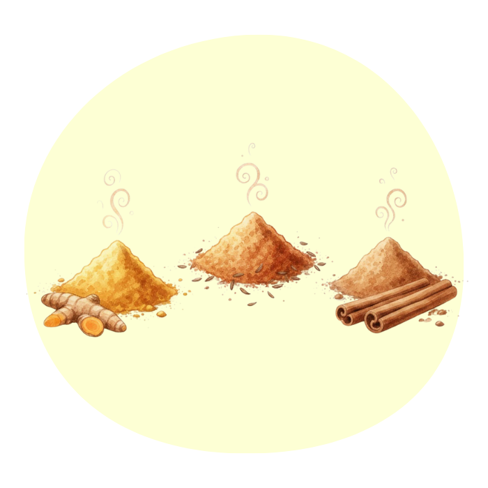 ターメリック、クミン、シナモンの3つのスパイスは、秋の冷え対策にもぴったりの香りトリオ。