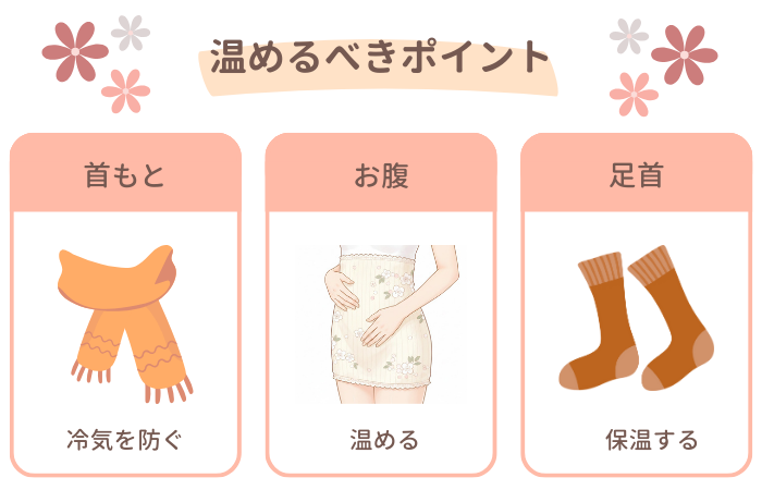 冷えやすい三つのポイント「首・お腹・足首」を意識的に温めましょう。