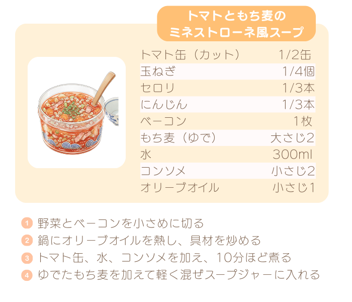 トマトのリコピンは抗酸化作用があり、血流を促進して冷えの改善にも役立ちます。さらにもち麦を加えることで、腹持ちのよい“食べるスープ”に。お弁当にもぴったりです。