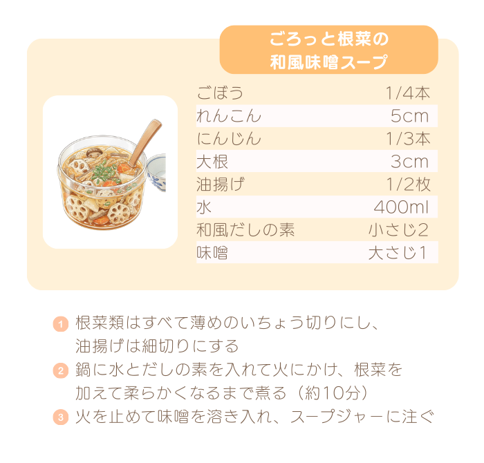 朝、温かいスープを入れておくだけで、お昼までしっかり温かさをキープ。具だくさんのスープなら、1品でも満足感たっぷり。冷え対策にも、忙しいワーママの時短ランチにもぴったりなんです。
