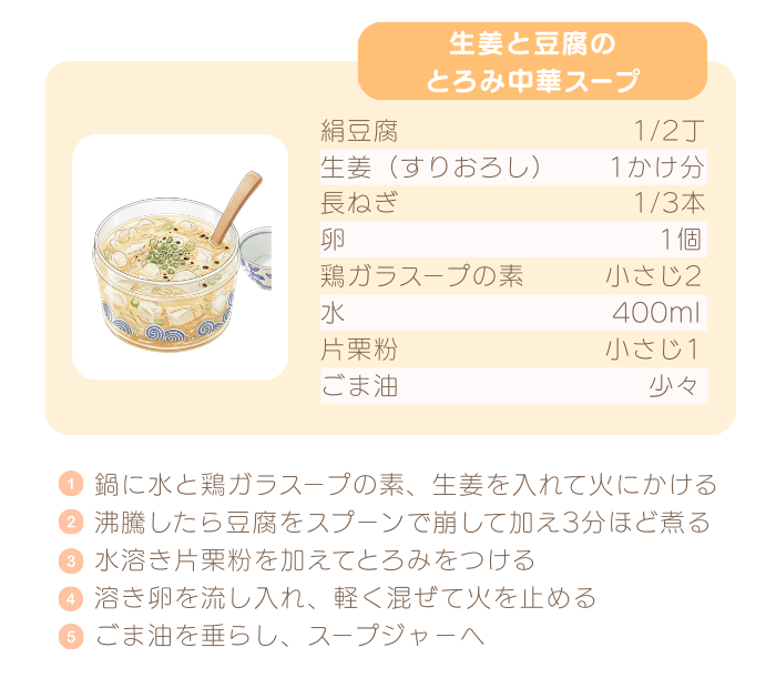 とろみのあるスープは、冷めにくくスープジャーに最適。生姜とごま油の香りで、食欲が落ちやすい冬場でもするりと食べられます。豆腐のたんぱく質も摂れるので、ヘルシーなのに満足度◎です。