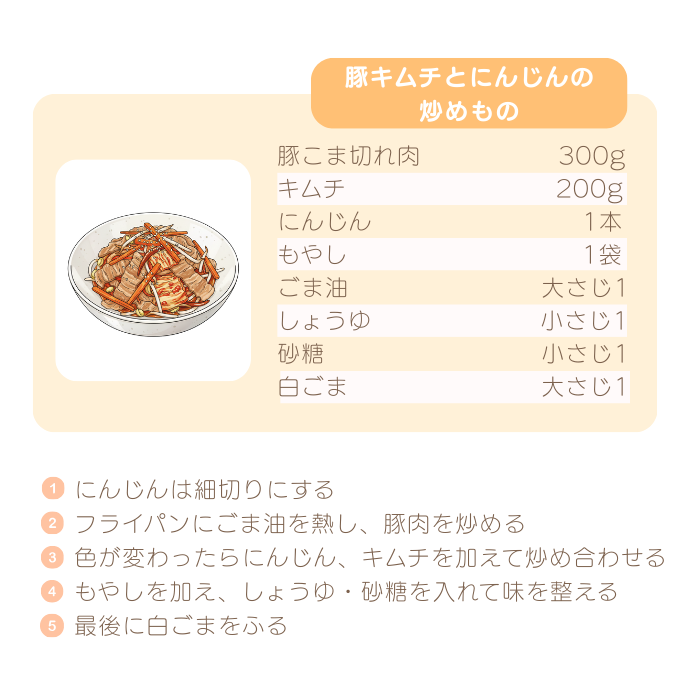 キムチの「赤い食材パワー」で体がぽかぽか。にんじんを加えることで甘みが出て、子どもでも食べやすくなります。
