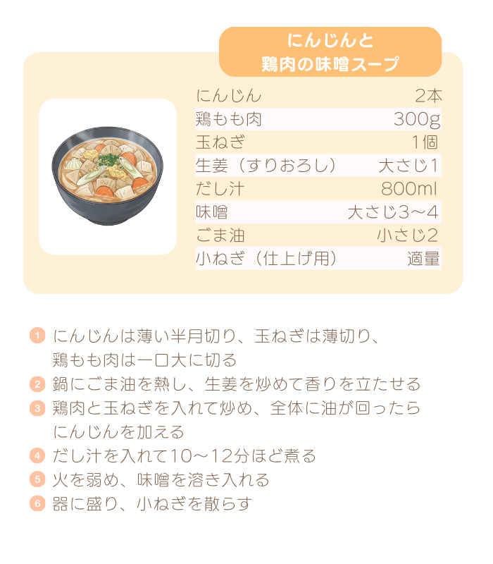 生姜+味噌の組み合わせは血流アップに最適。にんじんの甘みがやさしく、家族みんなが飲みやすいスープです。