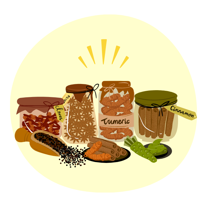 カレーやスープにシナモン、クミン、ターメリックなどのスパイスをプラスするのもおすすめ。スパイスには血管を拡張し、巡りをよくする作用があります。
