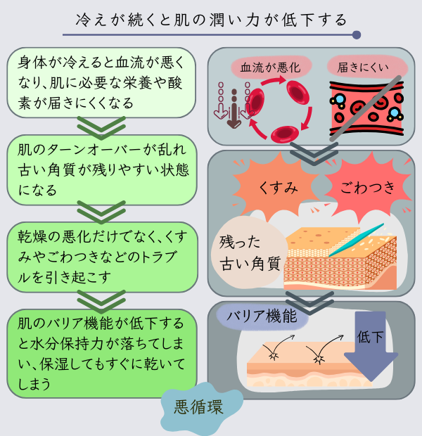 この結果、身体の内部が冷えていて肌表面は乾燥するという、冬特有の複合トラブルが発生します。