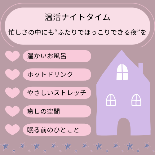 温活で体が温まり心が穏やかになっている状態だからこそ、短い言葉でも深く届きます。眠る前に気持ちを整える習慣は、夫婦の信頼感と安心感を育て、翌朝のエネルギーへつながる大切なルーティンに。