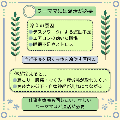 体が冷えると、肩こりや腰痛、むくみ、疲労感が取れにくくなるだけでなく、免疫力の低下や自律神経の乱れにもつながります。体調を崩せば、仕事も家庭も回らなくなる――だからこそ、忙しいワーママほど「体を温める習慣」が必要なのです。